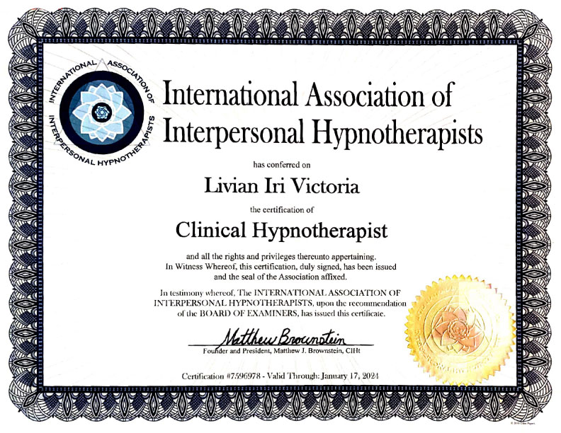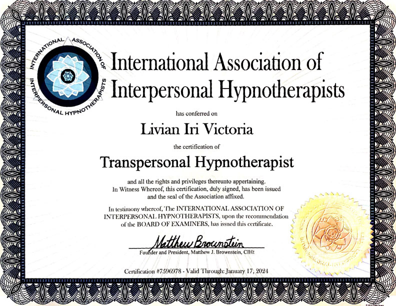 I hold State licensed Diplomas and Certificates in Hypnotherapy, Clinical Hypnotherapy and Interpersonal Hypnotherapy .