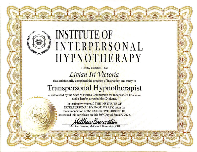 I was so impressed by the information I learned that I enrolled in the Institute of Interpersonal Hypnotherapy in Tampa Florida.